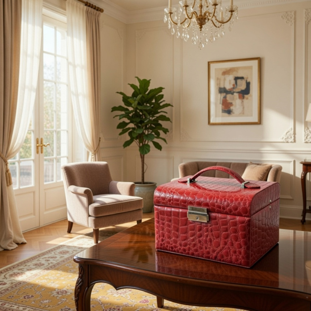 Подарункова шкатулка для ювелірних виробів у насиченому червоному кольорі з ефектним тисненням під натуральну крокодилову шкіру. Зовнішнє покриття — міцна екошкіра з глянцевим фінішем, що виглядає дорого й статусно.
